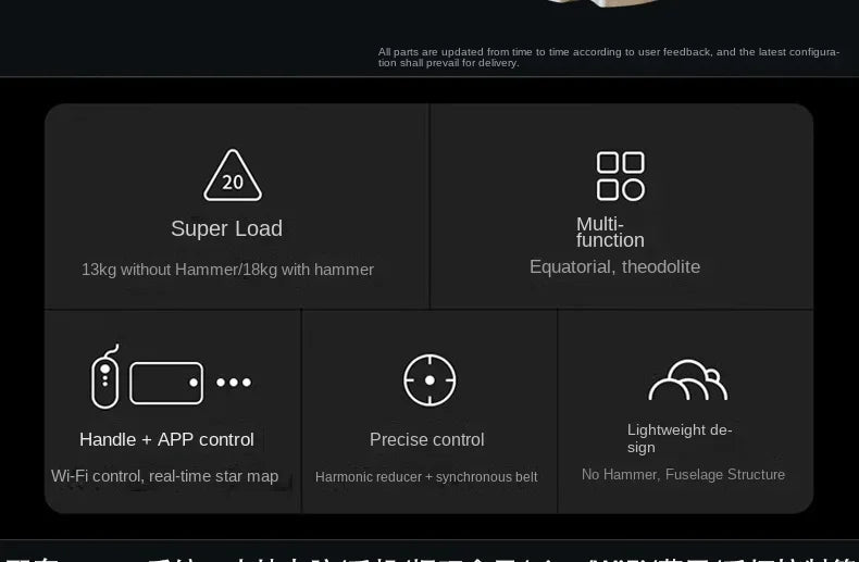 Modes: Equatorial mode + Theodolite mode (manual visual alignment)