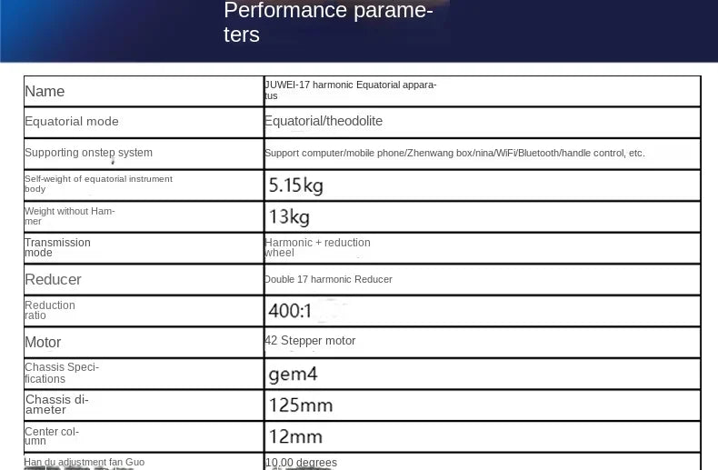 The JUWEI Double 17 is a compact harmonic equatorial mount built for both flexibility and performance. Its dual 17 harmonic reducer provides precise tracking for long-exposure astrophotography, while its lightweight design makes it perfect for portable setups.
