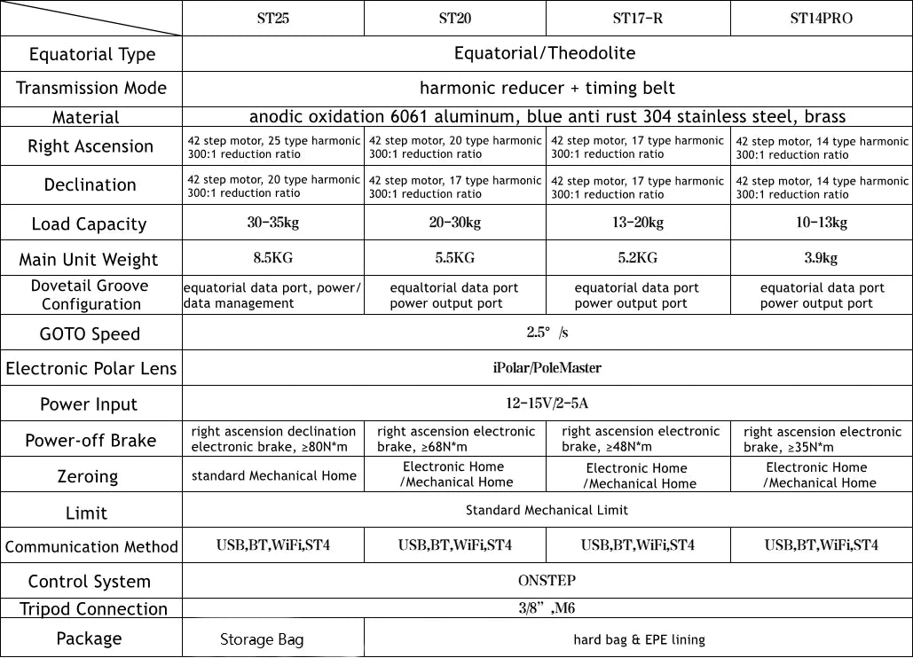 Designed for zero-backlash movement, the ST25 Pro uses a 25:1 harmonic gear reducer and supports advanced tracking via ASIAir, NINA, or OnStep. This model also includes mechanical home and limit protections, an integrated USB + power hub, and a compact footprint ideal for remote or mobile setups.